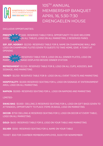 2026 - 105th Annual Membership Banquet presented by Kooper Leadership AcademyName: 2026 - 105th Annual Membership Banquet presented by Kooper Leadership AcademyDate: April 16, 2026Time: 5:30 PM - 7:30 PM EDTWebsite: http://www.hartsvillechamber.orgRegistration: Register Now Event Description:Our 105th Annual Membership Banquet presented by Kooper Leadership Academy will be held at Drengaelen House at Coker University and will include a networking social, a delicious meal, and awards ceremony. At this event, the chamber recaps the past year's plan of action, outlines the new year's plan, and presents awards to outstanding community leaders. Event Description:Our 105th Annual Membership Banquet presented by Kooper Leadership Academy will be held at Drengaelen House at Coker University and will include a networking social, a delicious meal, and awards ceremony. At this event, the chamber recaps the past year's plan of action, outlines the new year's plan, and presents awards to outstanding community leaders.