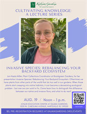 Kaelea will be presenting her lecture Invasive Species: Rebalancing Your Backyard Ecosystem. Oftentimes we have plants from other parts of the world that do too well in our gardens. When those plants start creeping into native habitats, it can become a devastating ecological problem – but one we can work to fix. Come learn how to distinguish the difference between our native and invasive flora, and what to do next!