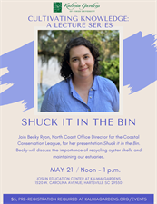 Join Becky Ryon, North Coast Office Director for the Coastal Conservation League, for her presentation in Kalmia Gardens? new adult education series, Cultivating Knowledge: A Lecture Series, at the Joslin Education Center. Pre-registration is required and tickets may be purchased for $5 here.