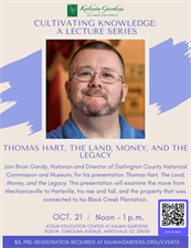 Brian will be presenting his lecture Thomas Hart, The Land, Money, and the Legacy. This presentation will examine the move from Mechanicsville to Hartsville, his rise and fall, and the property that was connected to his Black Creek Plantation.