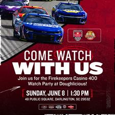Join us Sunday, June 8 at 1:30 p.m. at Doughlicious in downtown Darlington for the Firekeepers Casino 400! Don't miss your chance to win cool Darlington Raceway merchandise and tickets to the upcoming NASCAR Playoffs Weekend!