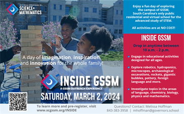 Enjoy a fun day of exploring the campus of GSSM, South Carolina’s only public residential and virtual school for the advanced study of STEM. All activities are FREE!