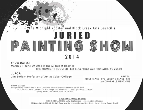 Event Description:The Midnight Rooster and Black Creek Arts Council are proud to present the 2014 Juried Painting Show! Submissions are no longer being accepted, but the art is still on display until the end of June. Come out to the Rooster and check out some of the finest art creations in the area!Location:The Midnight Rooster 136 E. Carolina Ave. Hartsville, SC 29550Contact Information:Set a Reminder:
