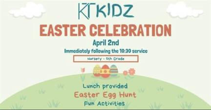 Save the date! Our KT Kidz will be having a fun easter celebration on April 2nd after the 10:30 service! We will start out with a spaghetti and hot dog lunch, then a special family Easter walk, then our Easter Egg hunt and inflatables!