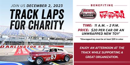 Join us for Track Laps for Charity at the track Too Tough To Tame. For $20 per car or an unwrapped toy (must be $20 value), you can take 3 laps around the 1.366 mile egg-shaped oval. The beneficiary for the event will be Toys for Tots and Darlington Shares.